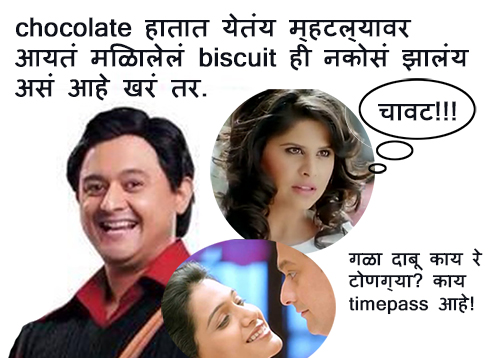 या dialogue नंतर मी पुढची १५ मिनट विचार करत होते चॉकलेट कोण आणि बिस्कीट कोण?? मिनू चॉकलेट? आणि सेक्सी कपड्यातली हॉट शिरीन बिस्कीट????? बहूत ना इंसाफी है. शब्दात नाही पण मनात श्रेयस ने नक्की म्हटलं असेल “